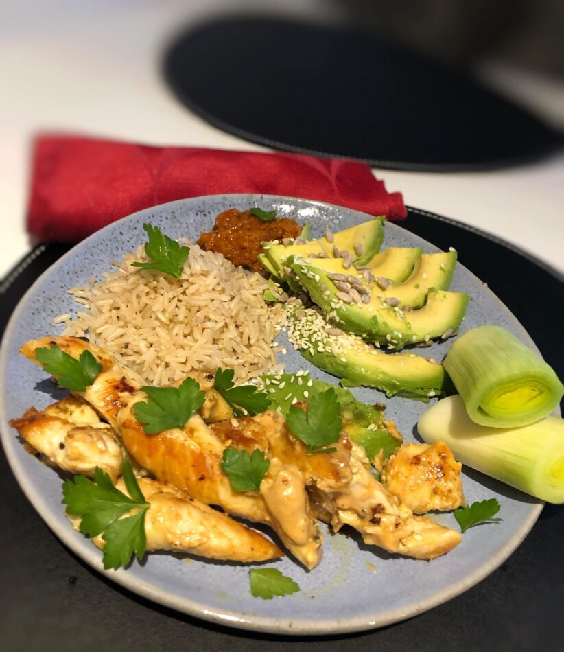 Sprød og saftige kyllingestykker med cremet peanutbutter og avokado
